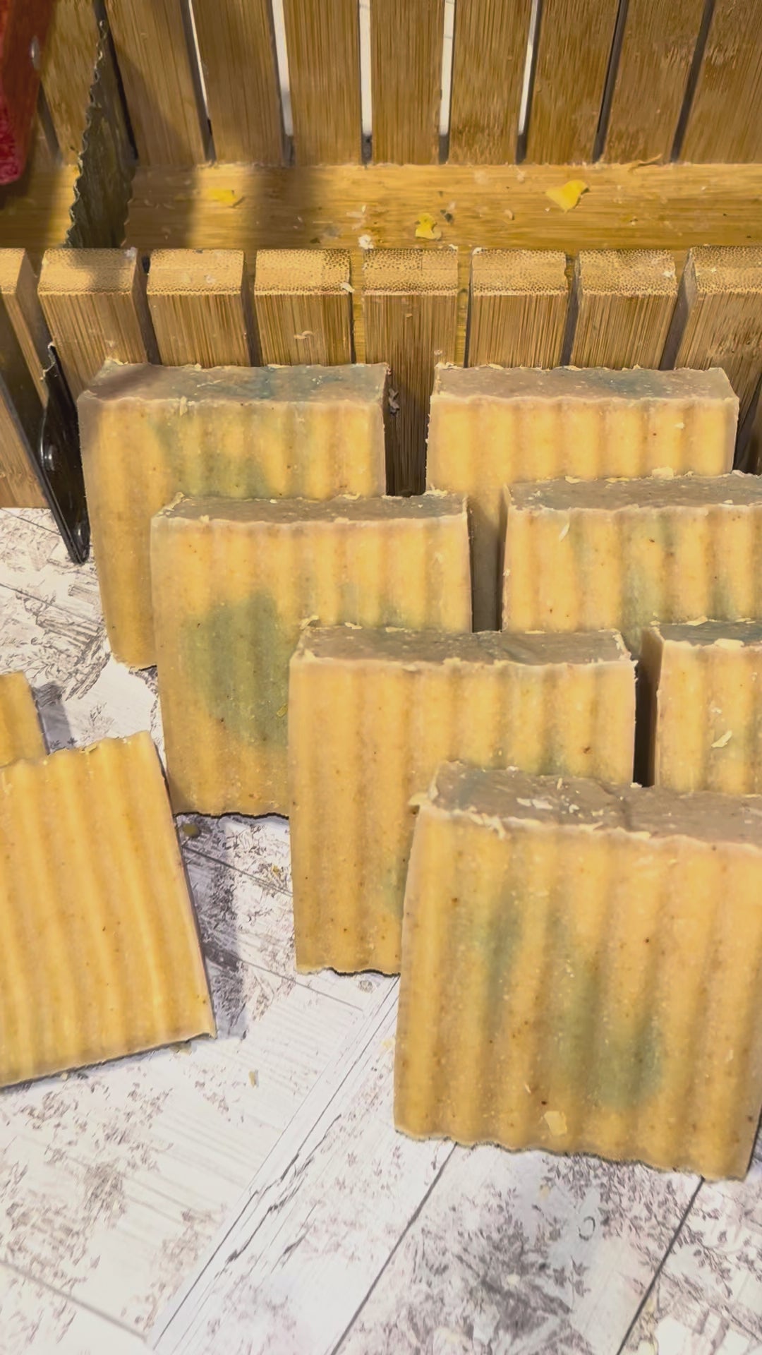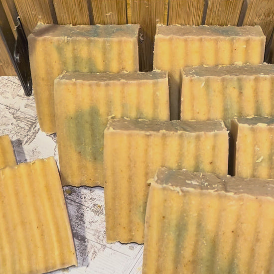 Beef tallow coconut oil olive oil buttermilk powder lavender powder distilled water lavender oil and baby powder frag.