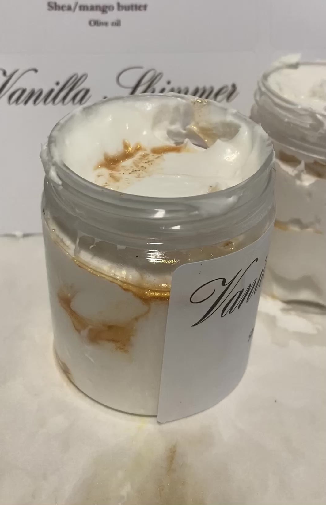 Nourish and hydrate your skin with our Shimmer Body Butter. Enriched with shea and mango butter, vanilla essential oil, and vitamin E, this moisturizer helps to improve skin's elasticity and leaves a subtle shimmer for a radiant glow. Perfect for all skin types, indulge in luxurious skin care today.Shea butter/Mango butter with avacodo oil and vitamin E